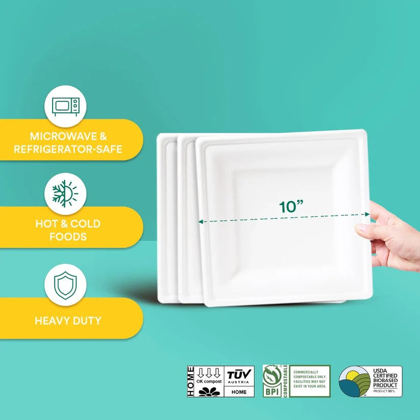 Ecoking® eco-friendly, sustainable 10-inch square white plate is crafted from 100% sustainable sugarcane fiber, offering durability and leak-proof quality that enhances your entertaining experience.