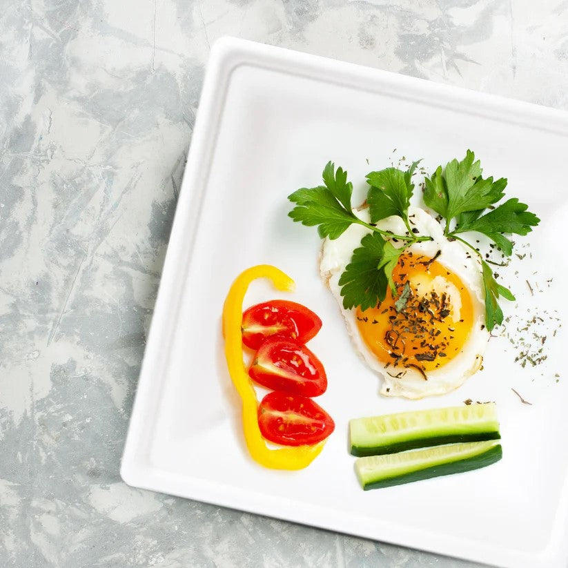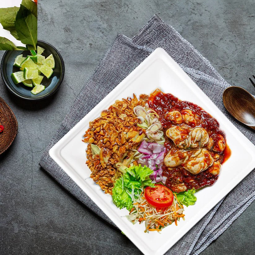 Ecoking® eco-friendly, sustainable 8-inch square white plate is crafted from 100% sustainable sugarcane fiber, offering durability and leak-proof quality that enhances your entertaining experience. Perfect for salads and small bites, it is certified to decompose and become compost within 90 to 180 days after disposal.